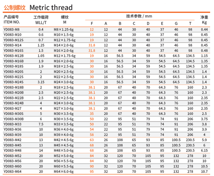 成华公制螺纹YD083-M8旋转吊环的设计使得吊装操作更加稳定和安全,同时也适用于索具连接,使连接点在各个方向上都具有灵活性,适应不同工况。在需要旋转的设备或机械结构中,成华万向旋转吊环可以作为连接点,提高操作效率。