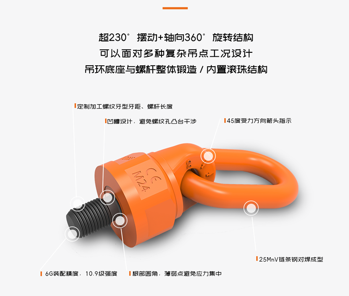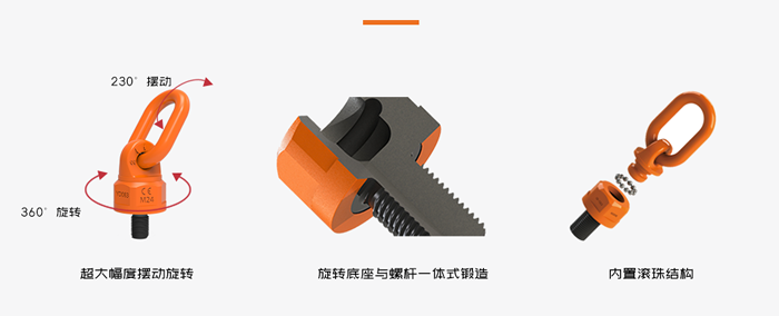 成华YD083-5/16美制万向旋转吊环由内外两个环组成,它们之间通过球形滚珠或滚柱连接,能够实现水平360度旋转和上下180度翻转,提供更大的灵活性和自由度。