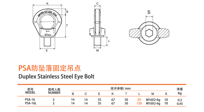 PSA-16防坠落固定吊点整体材质为双相不锈钢DSS,具有良好的耐腐蚀和力学性能。在海洋环境中及高度氯离子的环境中具有长期的稳定型。适应于永久露天的作业环境,此外PSA防坠落固定吊点下接高空安全带可应用于高空作业。