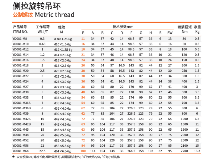 成华YD081-M8侧拉旋转吊环的设计允许在水平方向上进行360度旋转和垂直方向上的180度翻转,提供了更大的灵活性和自由度。YD081侧拉吊环可以用于连接各种索具,使连接点在各个方向上都具有灵活性,适应不同的吊装需求。在需要旋转的设备或机械结构中,侧拉旋转吊环可以作为连接点,提高操作效率。