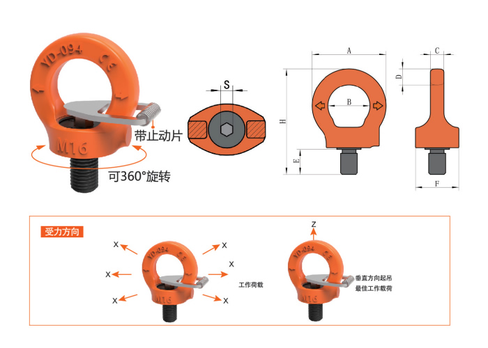 成华眼型旋转吊环通常由一个环和一个眼型接头组成,它们之间通过球形滚珠或滚柱连接,能够实现水平360度旋转和垂直180度翻转,提供更大的灵活性和自由度。